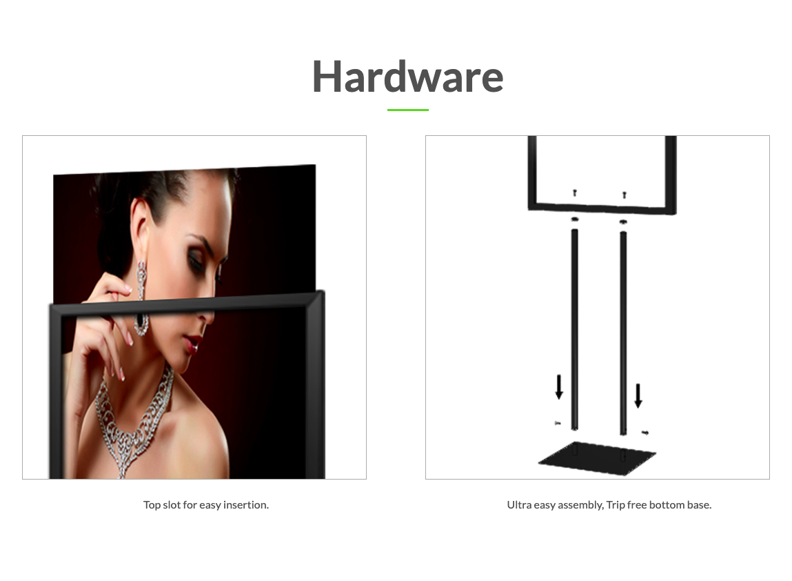 Strong, stable, and yet portable, all Aluminum construction provides easy assembly in minutes. It is great for fast and easy graphic change outs.