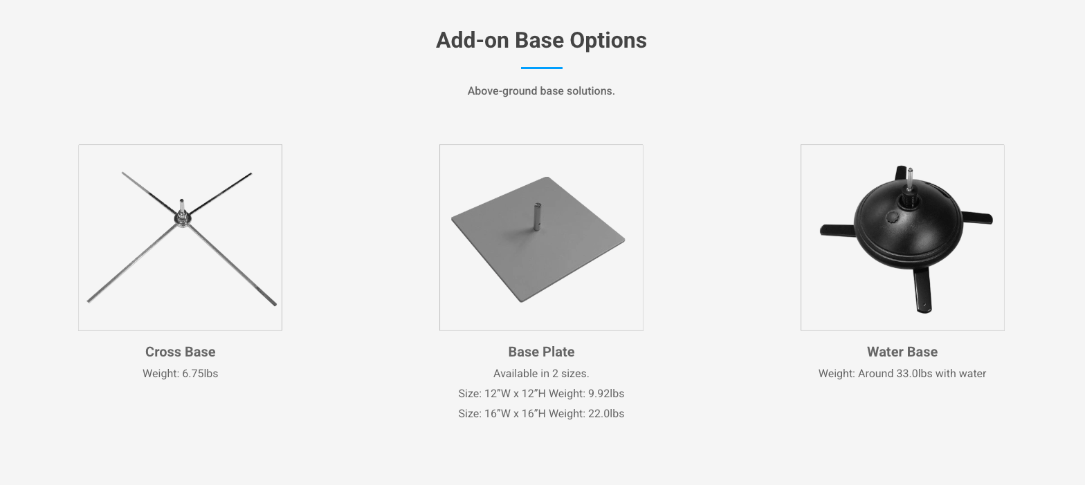 - A ground spike base as standard inclusions, other above-ground base solutions can be selected